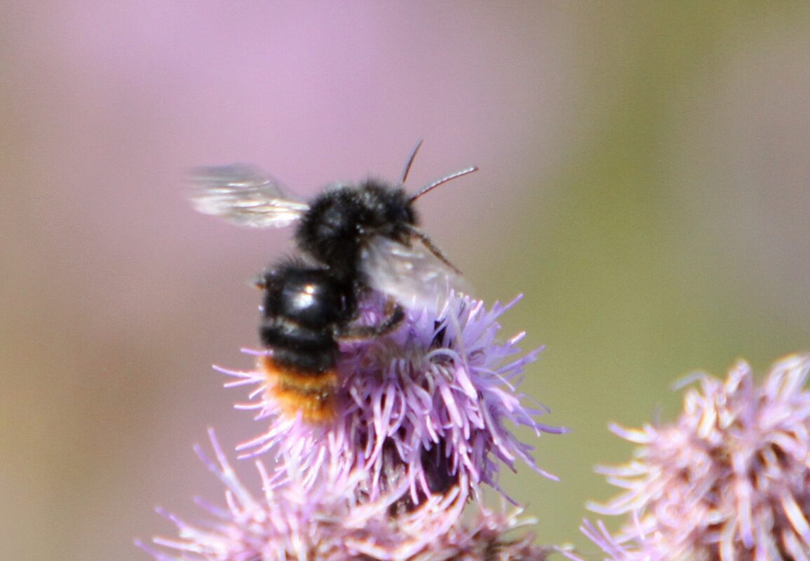 Dronene kan være litt mer utfordrende å artsbestemme. De har ikke alltid samme fargemønster som hunnene, og kan være både rufsete og solbleket ettersom de tilbringer hele døgnet utenfor bolet og er utsatt for vær og vind (du kan lese mer om humlenes liv her). Flere droner har en gul flekk i ansiktet som minner om en bart, og alle droner mangler pollenkurv på bakbeina, som er helt dekket av hår.